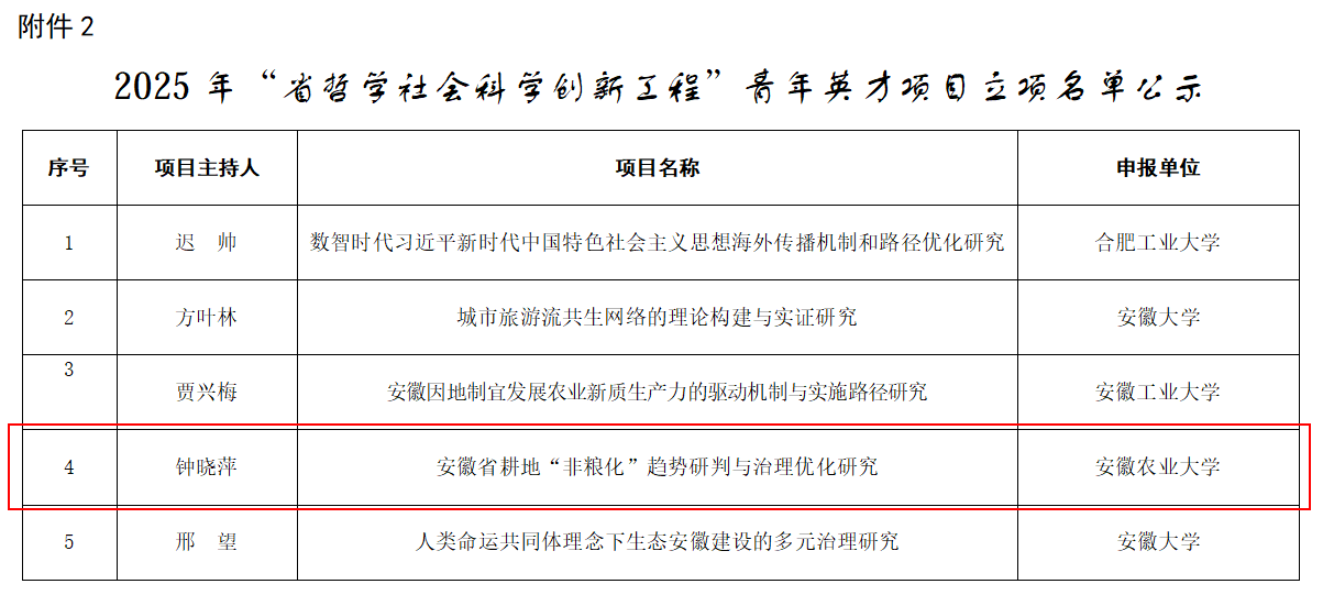 据悉,“省哲学社会科学创新工程”优秀青年项目及创新团队项目,是根据省委宣传思想工作和意识形态工作领导小组《哲学社会科学创新工程实施方案》(皖宣组字〔2023〕3号)及《省哲学社会科学创新工程优秀青年人才及创新团队培育计划实施方案》(皖社科联字〔2024〕14号)精神,为进一步加强我省哲学社会科学人才队伍建设所采取的重要举措。2025年度“省哲学社会科学创新工程”,最终遴选5个创新团队项目、5个青年英才项目及10个青年俊才项目,我院教师能够入选青年英才项目,体现了研究院近年来强化有组织科研的显著成效,以及在推动高水平研究方面所积累的深厚基础,展现出研究院在高水平哲学社会科学人才培养上的持续投入与积极成果。