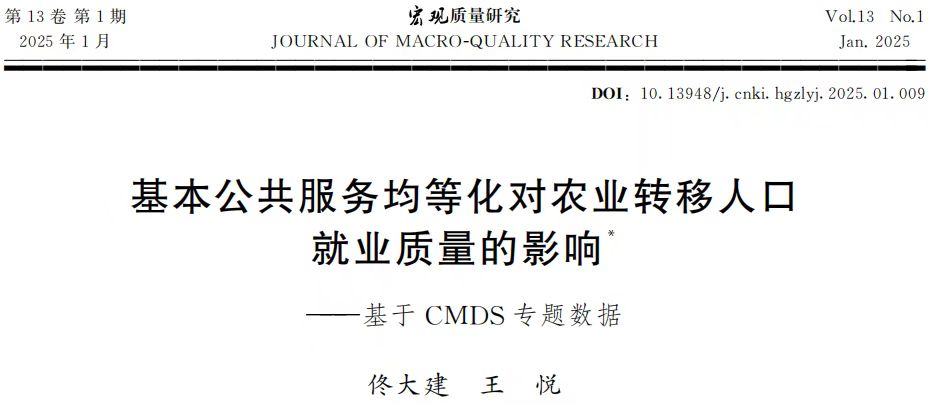 本网讯 近日,经济管理学院副教授佟大建和农林经济管理专业硕士研究生王悦合作揭示了基本公共服务均等化对农业转移人口就业质量的影响及作用机制。成果以“基本公共服务均等化对农业转移人口就业质量的影响——基于CMDS专题数据”为题,发表在《宏观质量研究》杂志上。