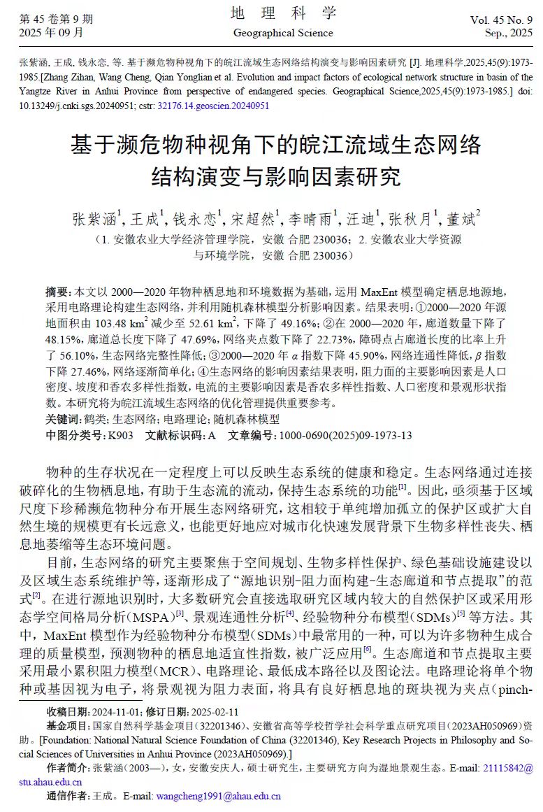 本网讯 近日,王成副教授联合董斌教授、南京师范大学李玉凤教授和中国科学院地理科学与资源研究所段后浪副研究员共同在“沿海土地围垦开发对珍稀野生动物影响”及“内陆大江大河流域生态网络构建与管理”等领域发表系列研究成果,相关成果发表在地理学CSSCI核心重要学术期刊《地理研究》2025年第10期、《地理科学》2025年第9期。系列研究基于地理学时空要素异质性与生态学物种生态位理论,构建沿江和沿海可持续土地利用模式背景下生物多样性保护与管理框架,为世界自然遗产地周边人类活动管理及流域生态修复与可持续发展提供技术和政策参考。