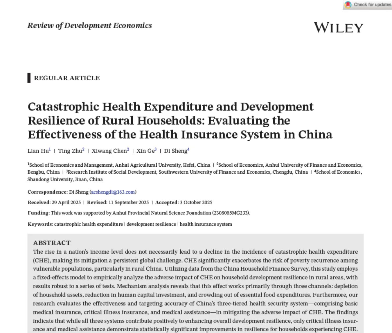 本网讯 近期,学院胡联教授的论文“Catastrophic Health Expenditure and Development Resilience of Rural Households: Evaluating the Effectiveness of the Health Insurance System in China”在Review Of Development Economics在线发表。