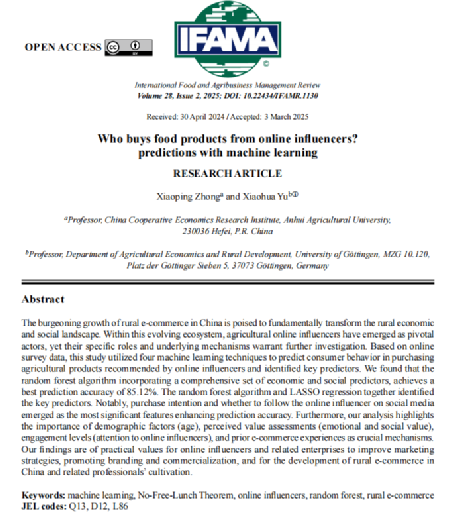 近日,我院钟晓萍教授与德国哥廷根大学农村发展与农业经济系于晓华教授的合作论文“Who buys food products from online influencers? predictions with machine learning”发表于SSCI来源期刊《International Food and Agribusiness Management Review》2025年第2期。该研究使用多种机器学习方法预测消费者购买网红推荐的农产品的行为,并识别关键预测因素,为推动农村电商发展提供了参考建议。