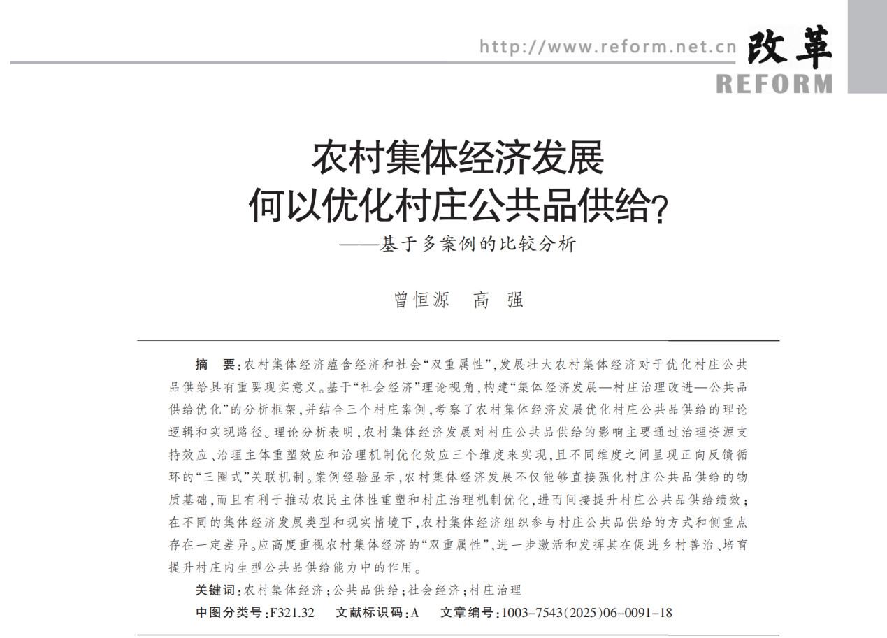 近日,我院特任副教授曾恒源和南京林业大学经济管理学院教授高强合作的论文“农村集体经济发展何以优化村庄公共品供给?——基于多案例的比较分析”在《改革》杂志发表。